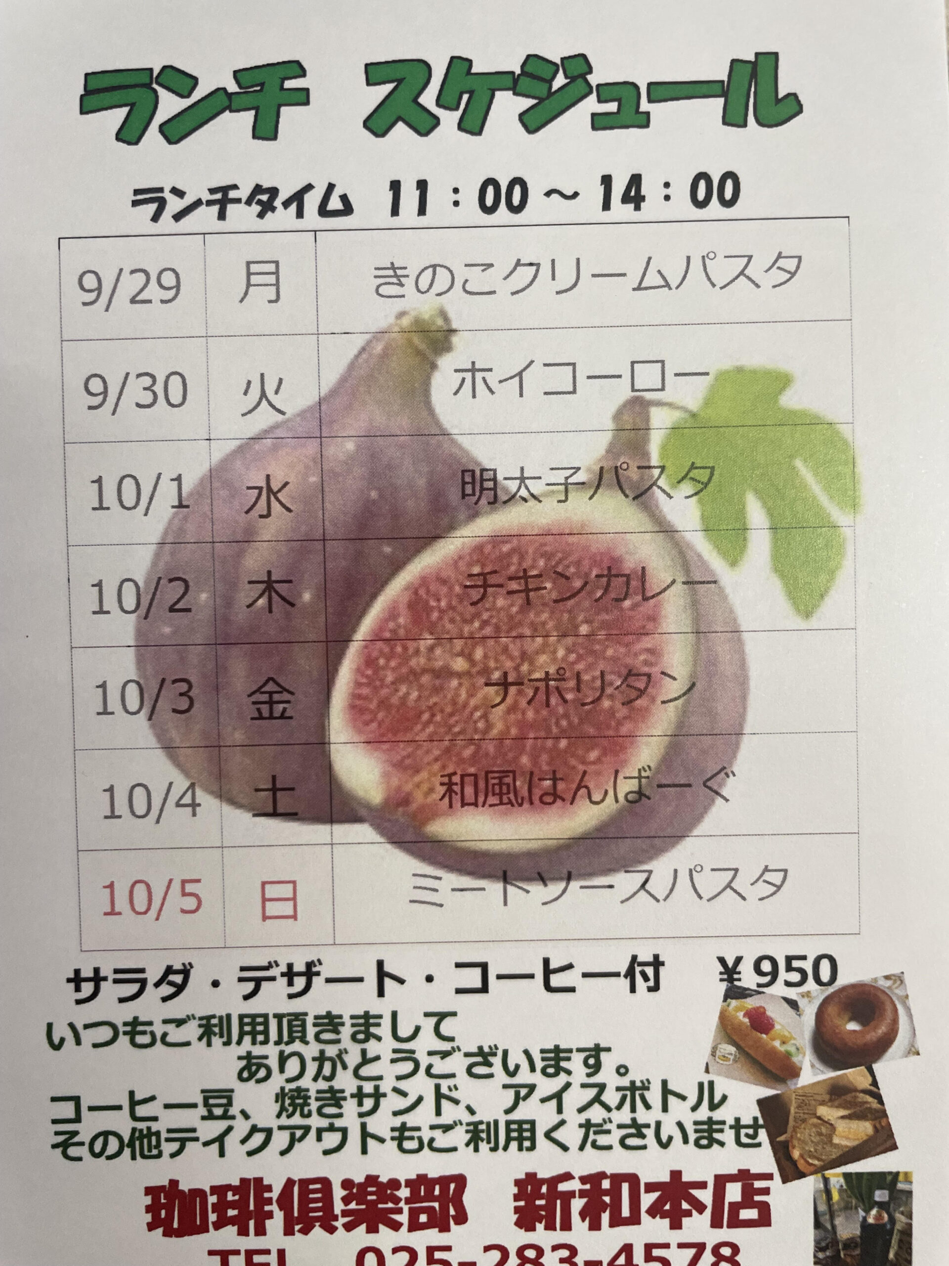 9月29日から10月5日のランチスケジュールのお知らせになります!今週も皆様のお越しを心からお待ちしております(^^♪