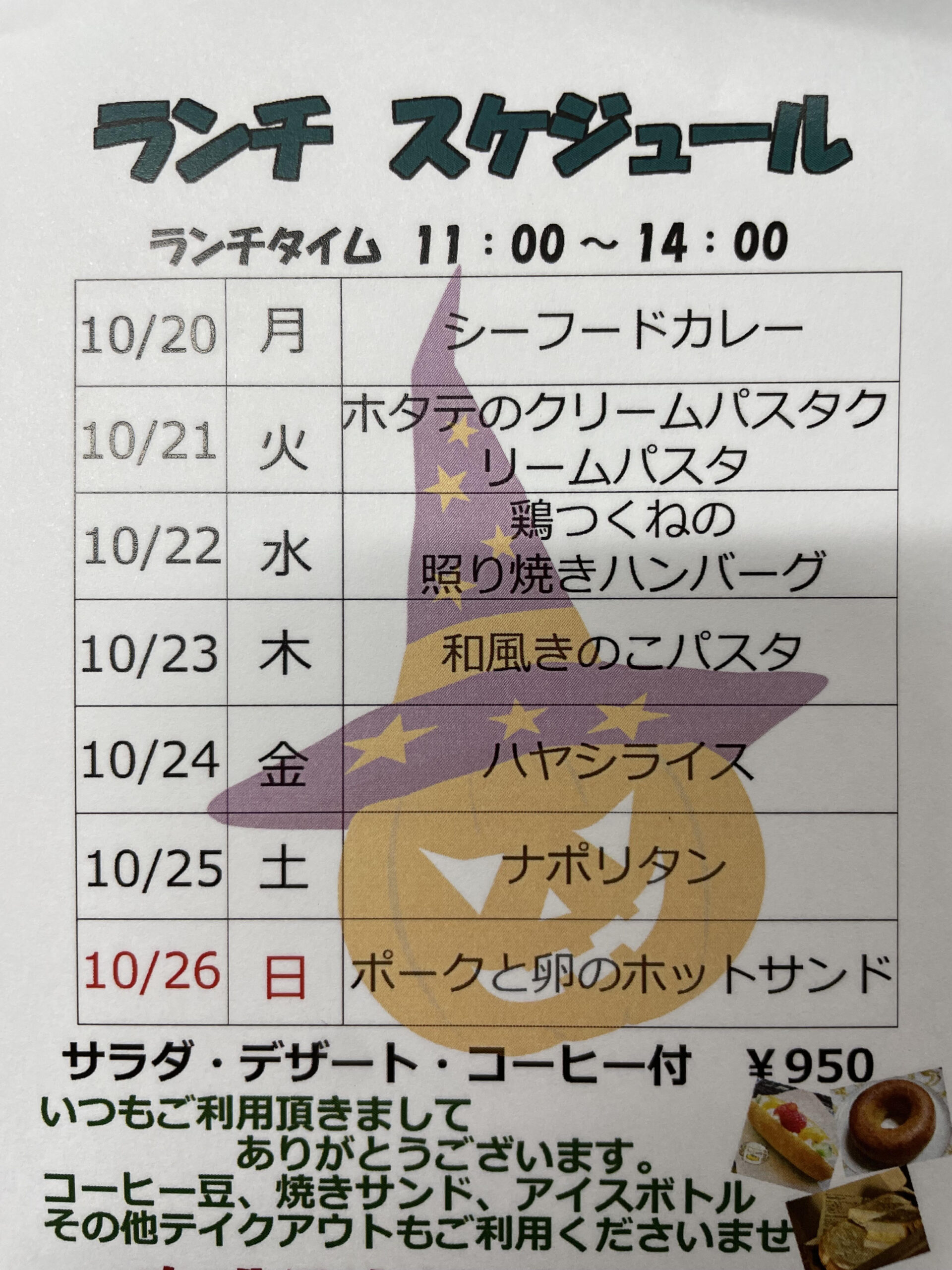 10月20日から10月26日までのランチスケジュールになります!今週もたくさんのご来店お待ちしております(*^^*)