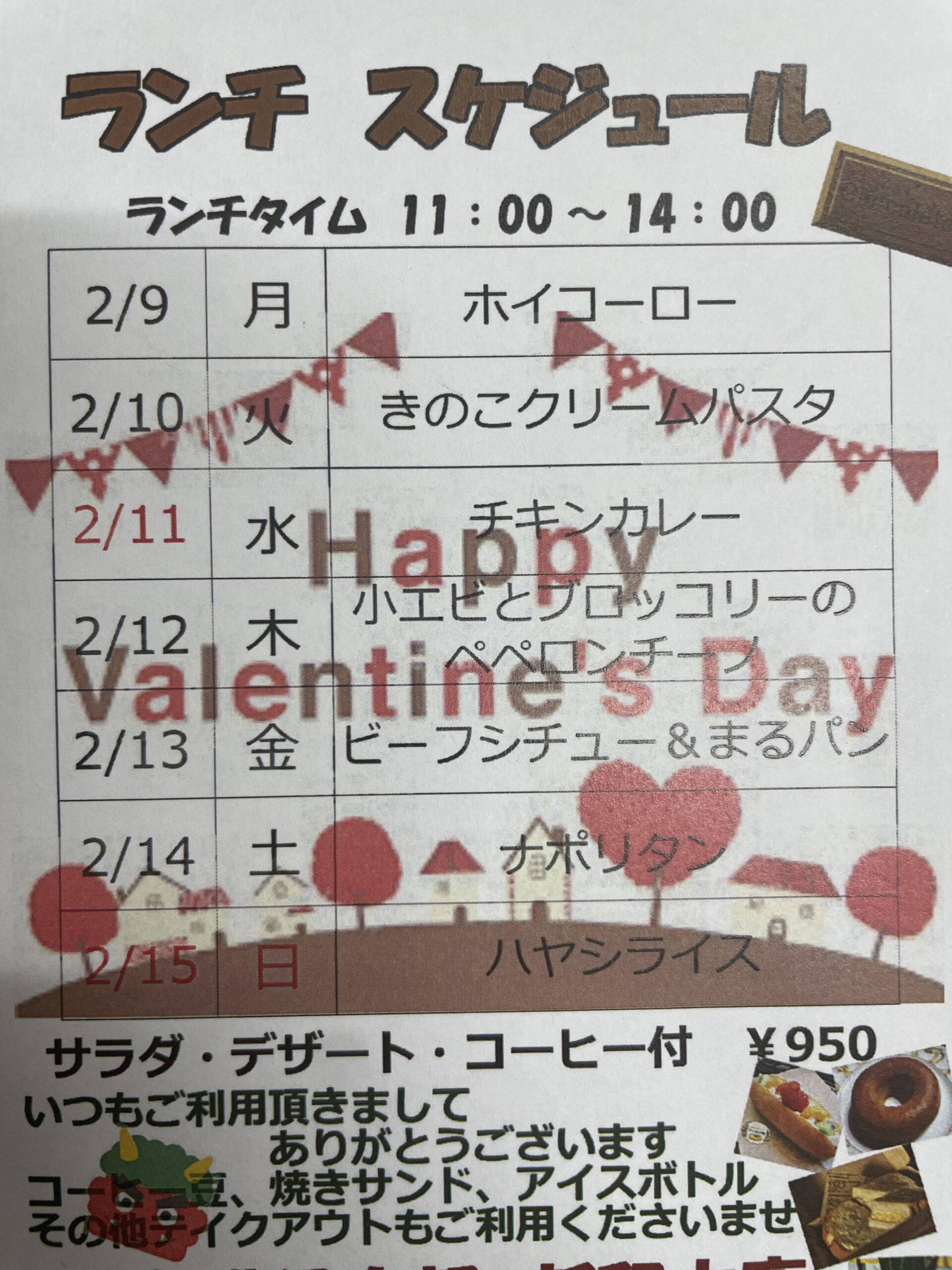 2月9日~2月15日のランチスケジュールのお知らせになります。こんnちは!珈琲倶楽部新和本店です(*^^*)